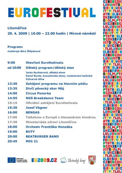 29.4.2009 se na litoměřickém Mírovém náměstí koná neformální setkání ministrů dopravy zemí Evropské unie. Po celý den bude probíhat doprovodný program pod názvem Eurofestival, během kterého na náměstí pozdraví občany například ministr Petr Bendl a o Evropě pohovoří s moderátorkou dne Bárou Štěpánovou senátor Alexandr Vondra, ale také i další politici. Připravena jsou i vystoupení orchestru Františka Honzáka, kapela Buty a Mig 21. Doprovodný program doplní výstavy regionálních firem a firem zabývajících se dopravní telematikou. Naše společnost SPEL, a.s. – Divize dopravních technologií, jako člen SDT (sdružení pro dopravní telematiku) přispěje svou prezentací SOS hlásky a prezentačním videem dopravní telematiky.