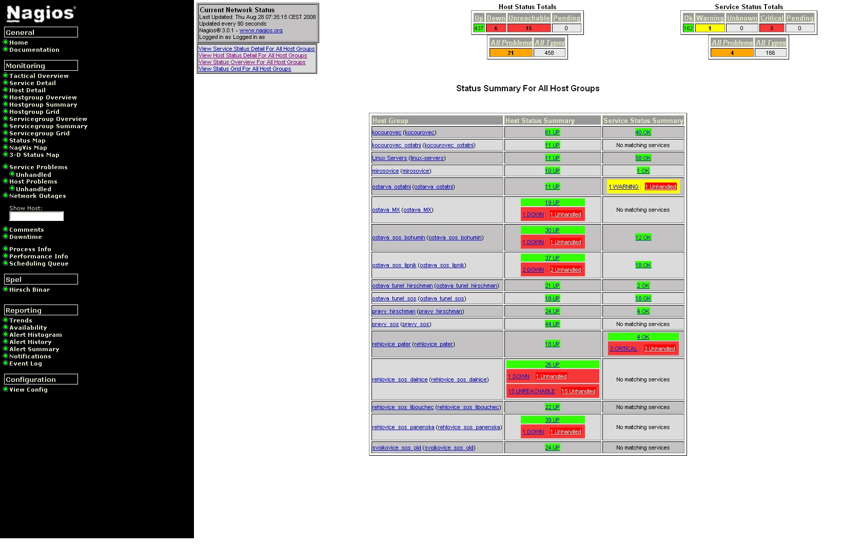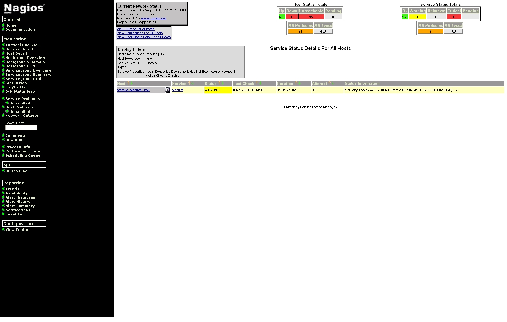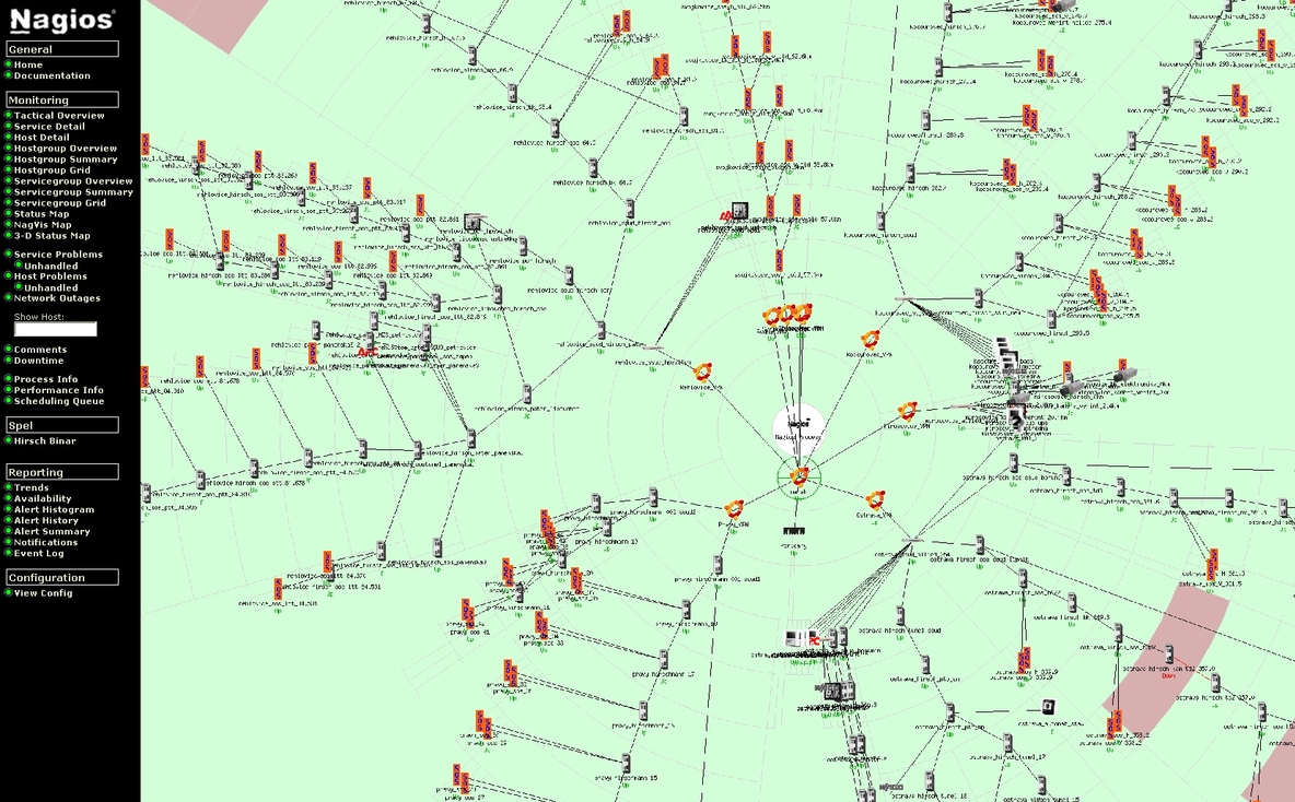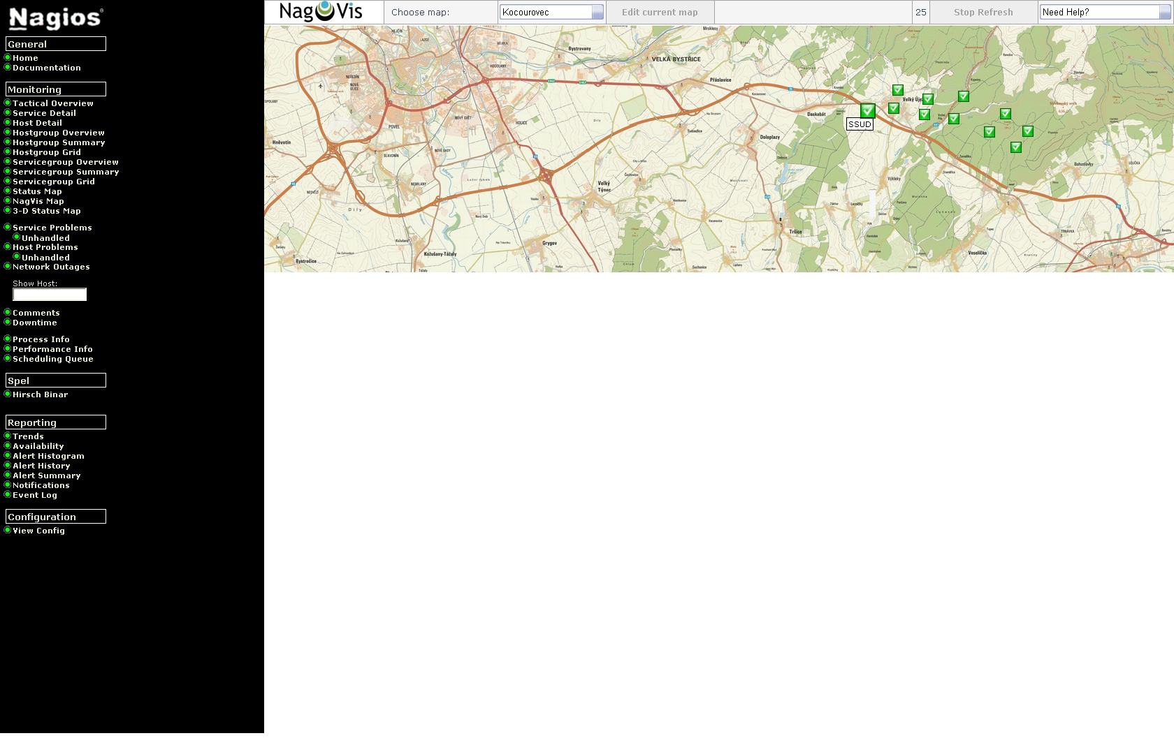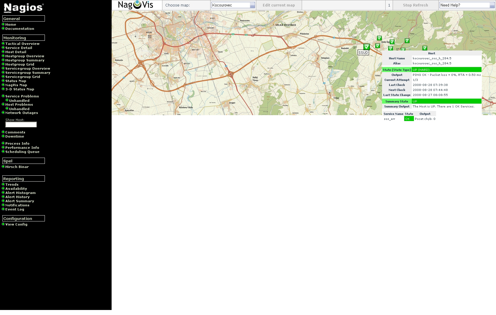 Bohužel žádná ethernetová síť nemůže být provozována bez monitoringu stavu jednotlivých prvků. A pro sítě, které zaručují např. bezpečnost silničního provozu, to platí o to víc. Díky sledování stavu sítě lze vyřešit případný vzniklý problém v co nejkratší době. Pro základní monitoring námi servisovaných sítí využíváme systém Nagios, který automaticky sleduje jednotlivá zařízení v síti (SOS hlásky, klientské počítače, servery, PLC, UPS,…) a na nich spuštěné služby.