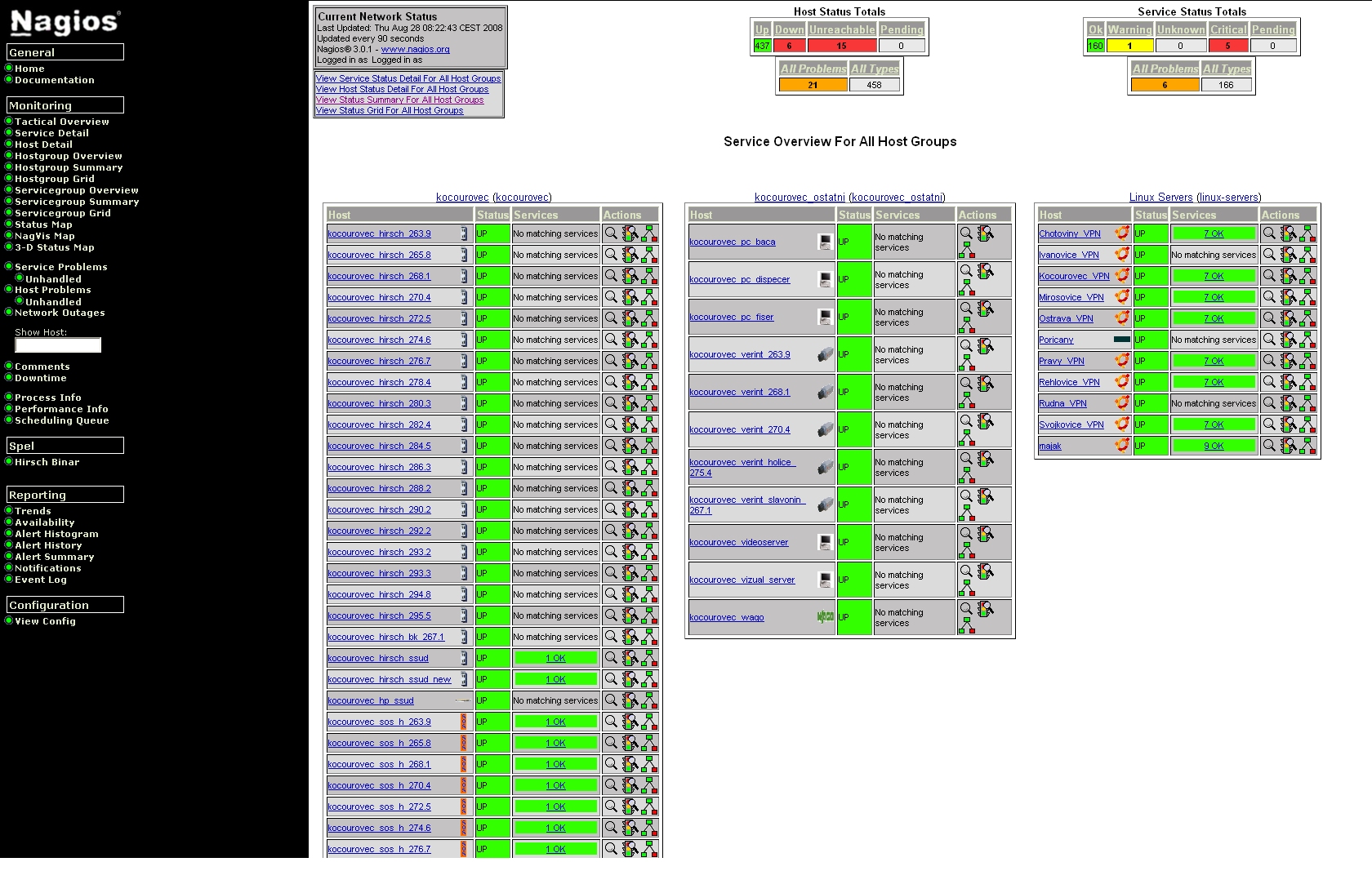 - prostřednictvím webového rozhraní zobrazení celkového stavu sítě, serverů a služeb na nich běžících