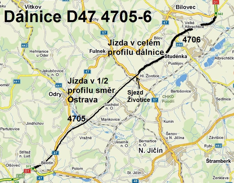 I tak, díky šířce jednoho pruhu, budou vozidla jezdit ve dvou jízdních pruzích v každém směru oddělena kužely. Takto se projede celá stavba 4705 až na začátek úseku 4706 (329,6km), kde dojde k rozdělení dopravy do dvou standardních dálničních jízdních směrů. Následně stavba plynule naváže v kilometru 341,5 (MUK Bílovec) na ostravskou 4707.Díky tomuto propojení dojde k výraznému odlehčení ostatních silnic v regionu spojující Ostravu s Olomoucí a Brnem. V rámci výstavby dálničního úseku 4706 naše společnost SPEL a.s. vybavila v minulých týdnech celý úsek telematickými zařízeními, jako jsou SOS hlásky, Proměnné dopravní značení, přehledový kamerový systém, závory pro silniční údržbu, meteo-systémy, Zařízeními pro proměnné informace a veškerým kabelovým propojením.Všechny zmíněné telematické systémy byly po oživení integrovány do jednotné vizualizace DIS (Dálniční Informační Systém) na SSÚD Ostrava, která slouží pro potřeby údržby dálnice D47(D1) a do NDIC.